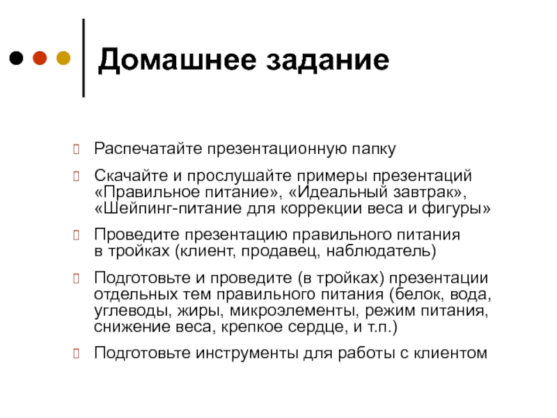 Выполните упражнение «Презентация клиенту», используя презентационную папку «Правильное питание»