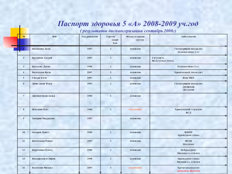 Слайд 8Паспорт здоровья 5 «А» 2008-2009 уч.год