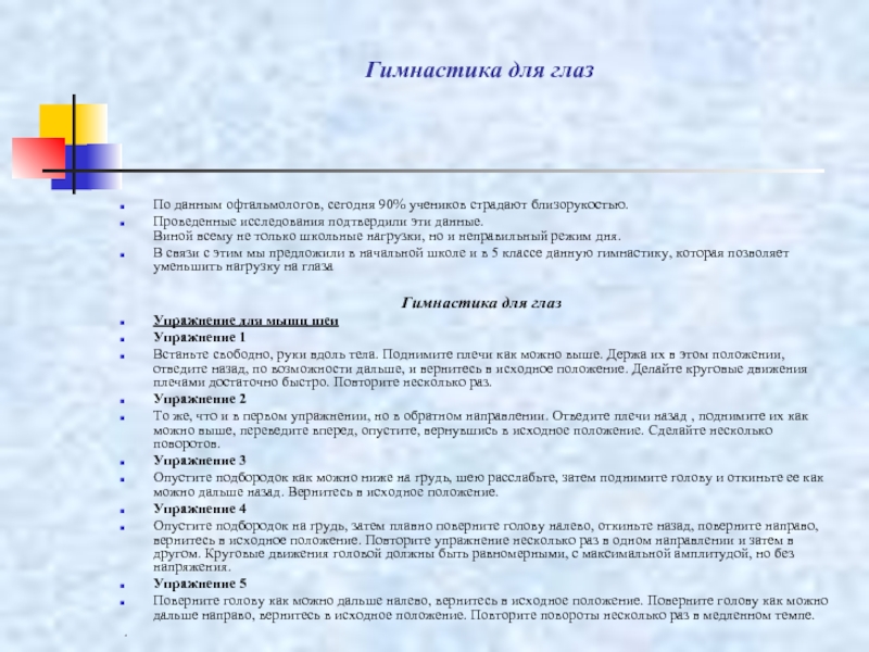 В связи с этим мы предложили в начальной школе и в 5 классе данную гимнастику, которая позволяет уменьшить нагрузку на глаза