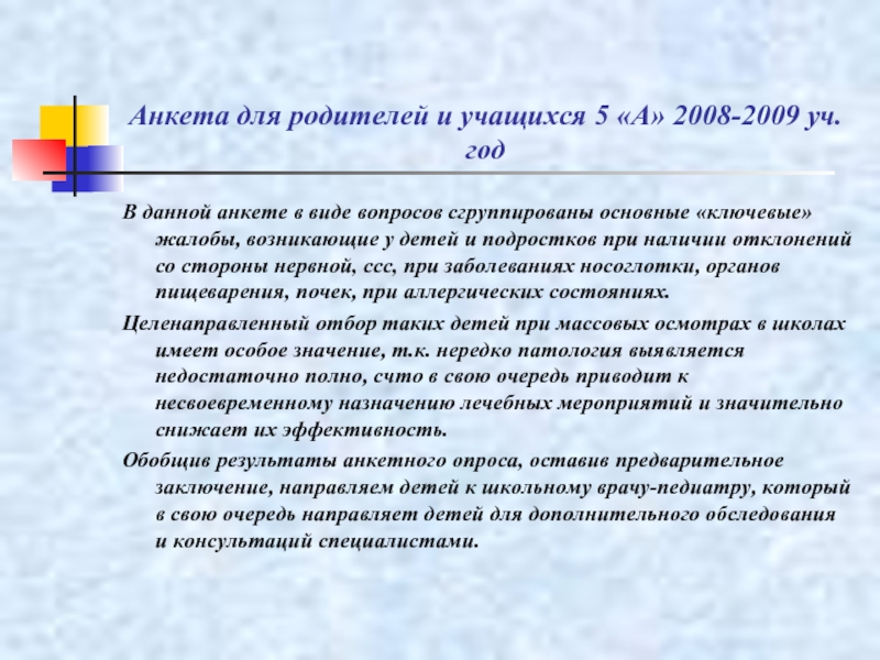 Слайд 4Анкета для родителей и учащихся 5 «А» 2008-2009 уч.год