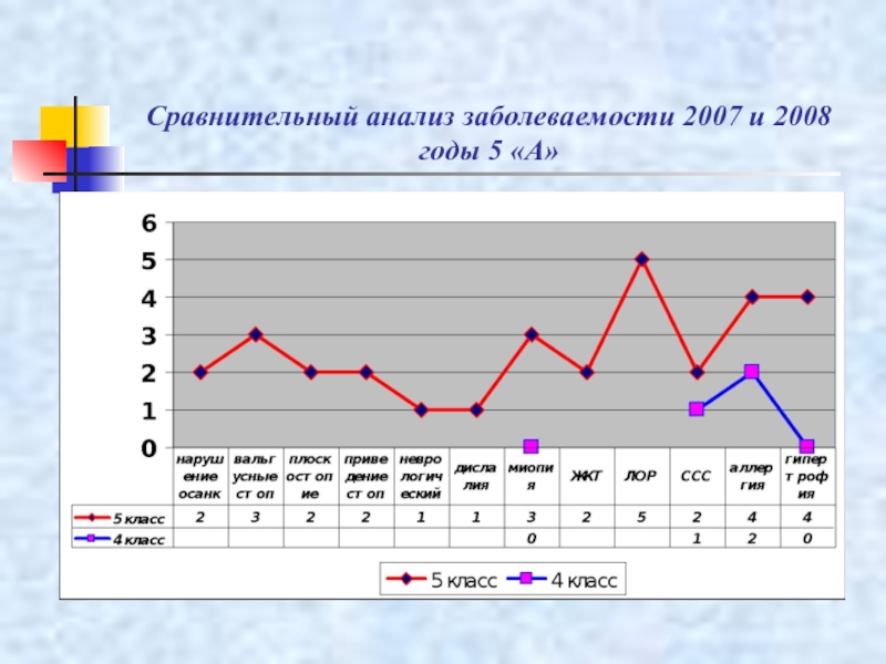 Слайд 11Сравнительный анализ заболеваемости 2007 и 2008 годы 5 «А»