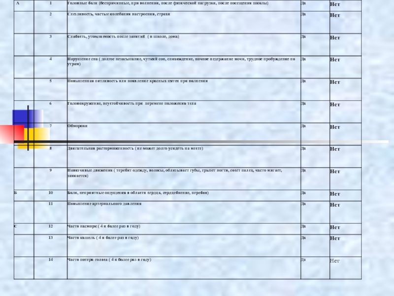 в виде вопросов сгруппированы основные «ключевые» жалобы, возникающие у детей и подростков при наличии отклонений со стороны нервной, ссс, при заболеваниях носоглотки, органов пищеварения, почек, при аллергических состояниях.