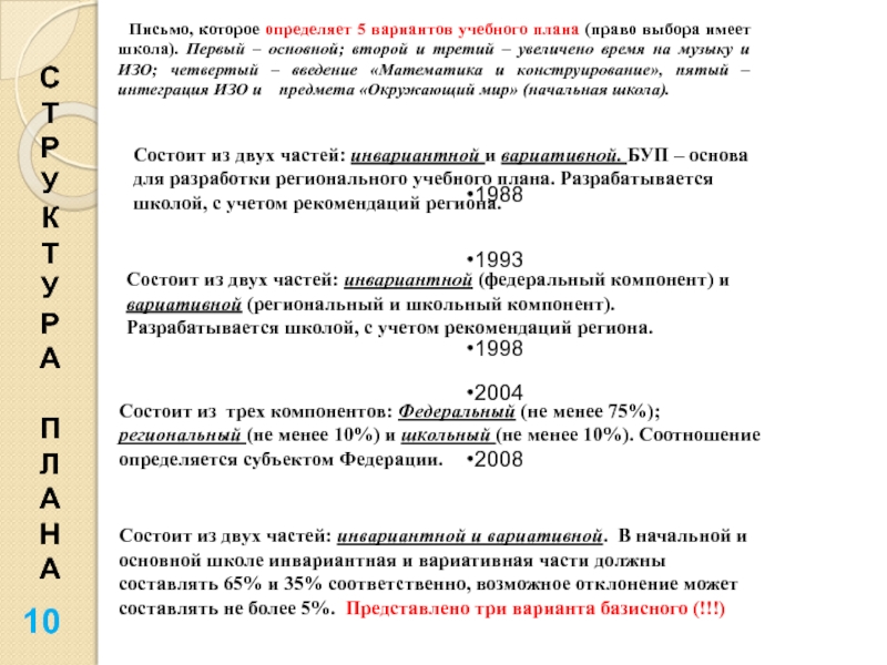 Состоит из двух частей: инвариантной и вариативной. В начальной и основной школе инвариантная и вариативная части должны составлять 65% и 35% соответственно, возможное отклонение может составлять не более 5%. Представлено три варианта базисного (!!!)