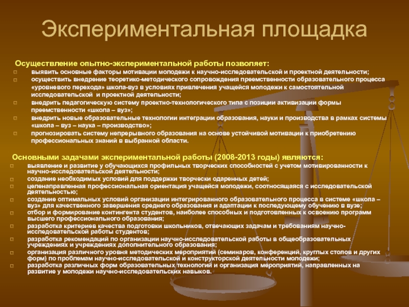 осуществить внедрение теоретико-методического сопровождения преемственности образовательного процесса «уровневого перехода» школа-вуз в условиях привлечения учащейся молодежи к самостоятельной исследовательской и проектной деятельности;