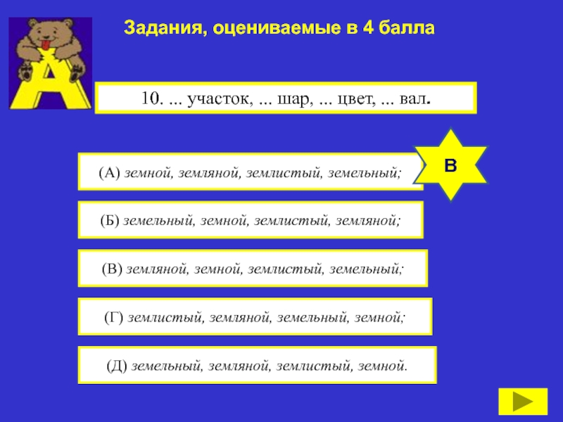 10. ... участок, ... шар, ... цвет, ... вал.