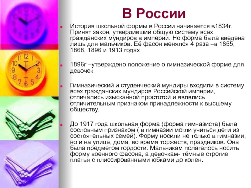 История школьной формы в России начинается в1834г. Принят закон, утвердивший