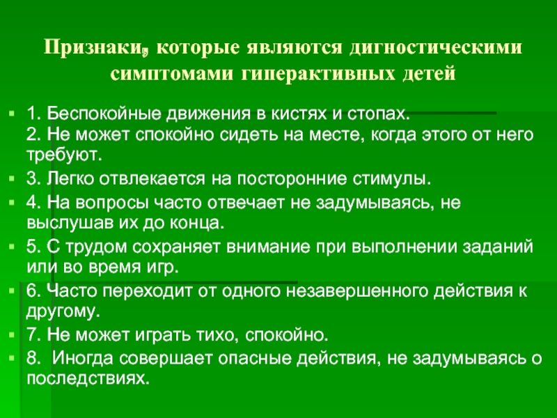 Слайд 8Признаки, которые являются дигностическими симптомами гиперактивных детей
