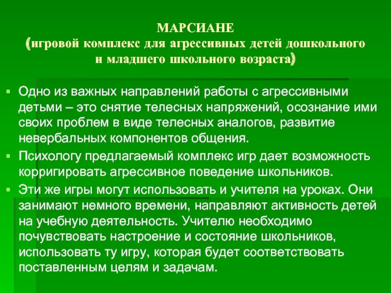 Психологу предлагаемый комплекс игр дает возможность корригировать агрессивное поведение школьников.