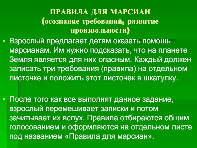 После того как все выполнят данное задание, взрослый перемешивает записки и потом зачитывает их вслух. Правила отбираются общим голосованием и оформляются на отдельном листе под названием «Правила для марсиан».