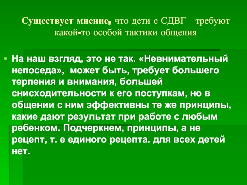 Слайд 12Существует мнение, что дети с СДВГ требуют какой-то особой тактики