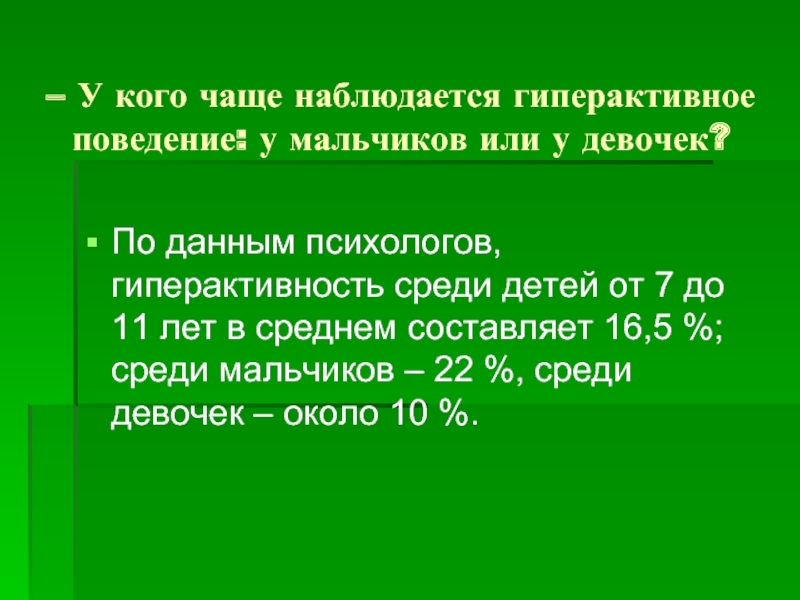 По данным психологов, гиперактивность среди детей от 7 до 11 лет в среднем составляет 16,5 %; среди мальчиков – 22 %, среди девочек – около 10 %.