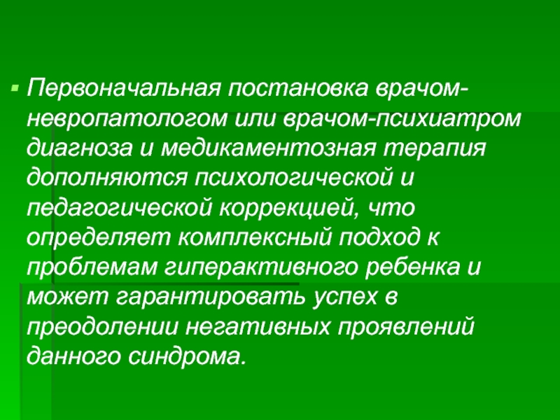 и педагогической коррекцией, что определяет комплексный подход к проблемам гиперактивного ребенка и может гарантировать успех в преодолении негативных проявлений данного синдрома.