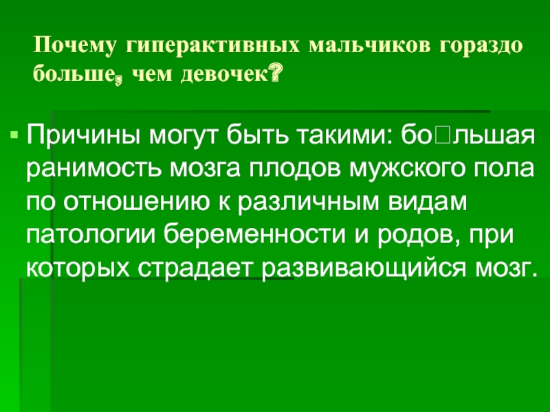 Слайд 10Почему гиперактивных мальчиков гораздо больше, чем девочек?