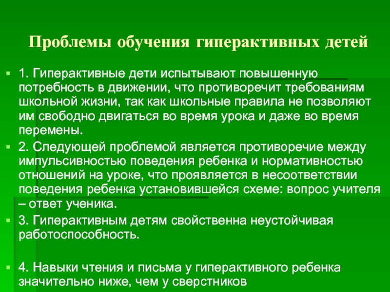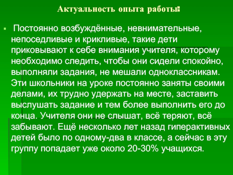 приковывают к себе внимания учителя, которому необходимо следить, чтобы они сидели спокойно, выполняли задания, не мешали одноклассникам. Эти школьники на уроке постоянно заняты своими делами, их трудно удержать на месте, заставить выслушать задание и тем более выполнить его до конца. Учителя они не слышат, всё теряют, всё забывают. Ещё несколько лет назад гиперактивных детей было по одному-два в классе, а сейчас в эту группу попадает уже около 20-30% учащихся.