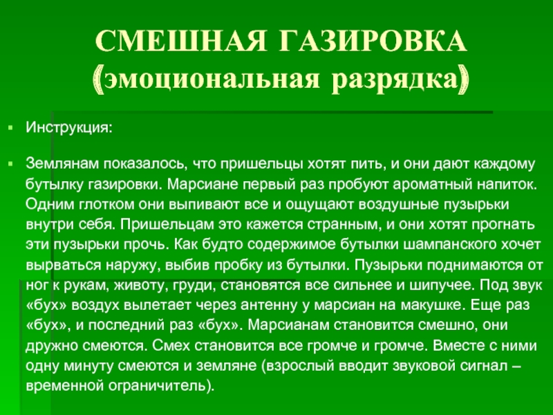 каждому бутылку газировки. Марсиане первый раз пробуют ароматный напиток. Одним глотком они выпивают все и ощущают воздушные пузырьки внутри себя. Пришельцам это кажется странным, и они хотят прогнать эти пузырьки прочь. Как будто содержимое бутылки шампанского хочет вырваться наружу, выбив пробку из бутылки. Пузырьки поднимаются от ног к рукам, животу, груди, становятся все сильнее и шипучее. Под звук «бух» воздух вылетает через антенну у марсиан на макушке. Еще раз «бух», и последний раз «бух». Марсианам становится смешно, они дружно смеются. Смех становится все громче и громче. Вместе с ними одну минуту смеются и земляне (взрослый вводит звуковой сигнал – временной ограничитель).