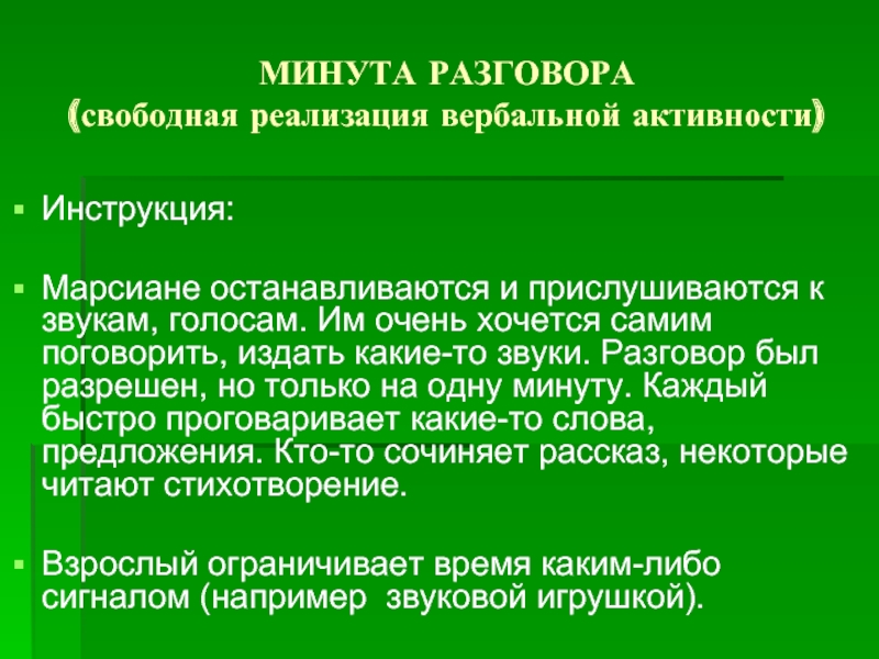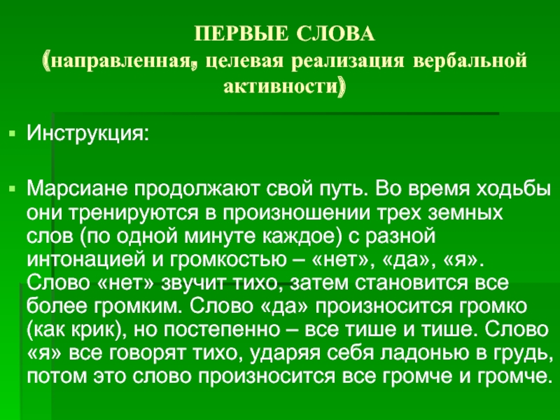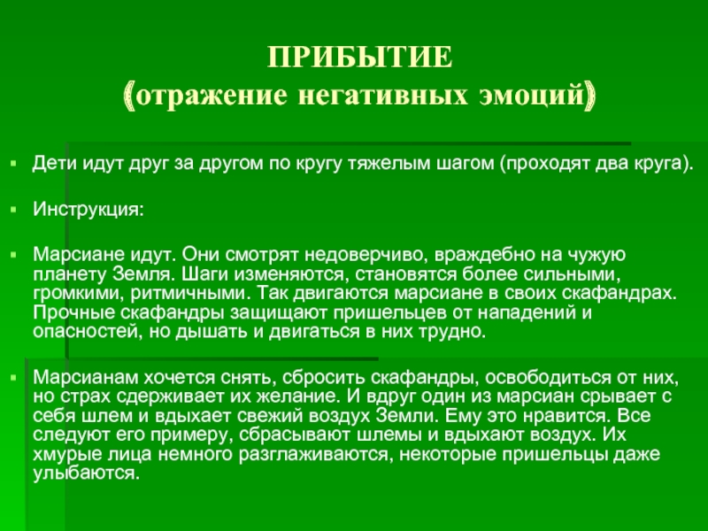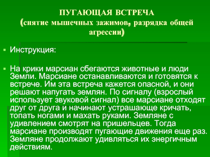 и люди Земли. Марсиане останавливаются и готовятся к встрече. Им эта встреча кажется опасной, и они решают напугать землян. По сигналу (взрослый использует звуковой сигнал) все марсиане отходят друг от друга и начинают устрашающе кричать, топать ногами и махать руками. Земляне с удивлением смотрят на пришельцев. Тогда марсиане производят пугающие движения еще раз. Земляне продолжают удивляться их энергичным действиям.