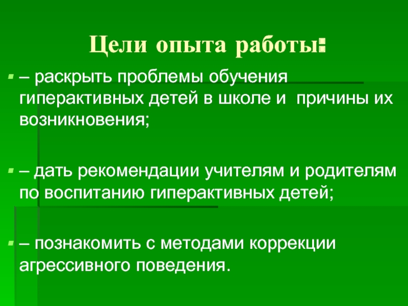 – раскрыть проблемы обучения гиперактивных детей в школе и