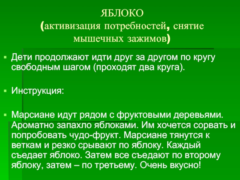 Марсиане идут рядом с фруктовыми деревьями. Ароматно запахло яблоками. Им хочется сорвать и попробовать чудо-фрукт. Марсиане тянутся к веткам и резко срывают по яблоку. Каждый съедает яблоко. Затем все съедают по второму яблоку, затем – по третьему. Очень вкусно!