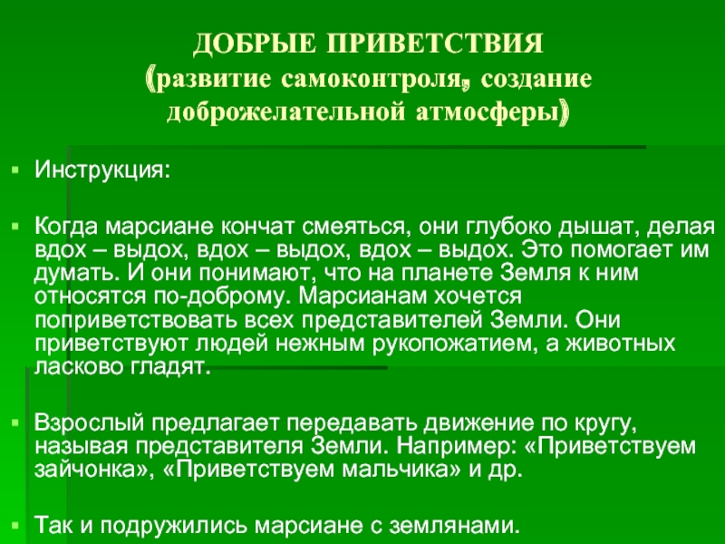 дышат, делая вдох – выдох, вдох – выдох, вдох – выдох. Это помогает им думать. И они понимают, что на планете Земля к ним относятся по-доброму. Марсианам хочется поприветствовать всех представителей Земли. Они приветствуют людей нежным рукопожатием, а животных ласково гладят.