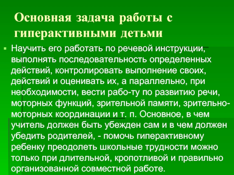 выполнять последовательность определенных действий, контролировать выполнение своих, действий и оценивать их, а параллельно, при необходимости, вести работу по развитию речи, моторных функций, зрительной памяти, зрительно-моторных координации и т. п. Основное, в чем учитель должен быть убежден сам и в чем должен убедить родителей, - помочь гиперактивному ребенку преодолеть школьные трудности можно только при длительной, кропотливой и правильно организованной совместной работе.