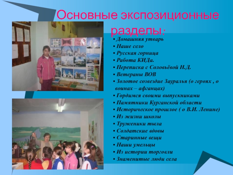 экспозиций музея: «Домашняя утварь», «Наше село», «Ветераны ВОВ», «Золотое созвездие Зауралья (о героях , о воинах – афганцах)», « Гордимся своими выпускниками», «Из жизни школы», «Труженики тыла», «Старинные вещи», «Наши умельцы», «Знаменитые люди села» началось с поисковой деятельности обучающихся. В настоящее время материал систематизирован и оформлен.