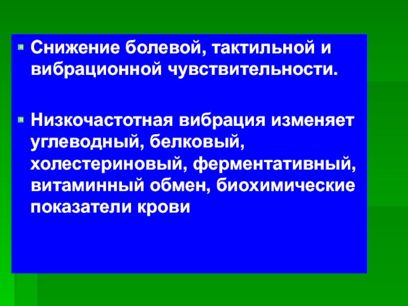 Слайд 23Снижение болевой, тактильной и вибрационной чувствительности.