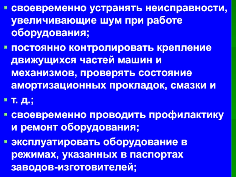 Слайд 10своевременно устранять неисправности, увеличивающие шум при работе оборудования;