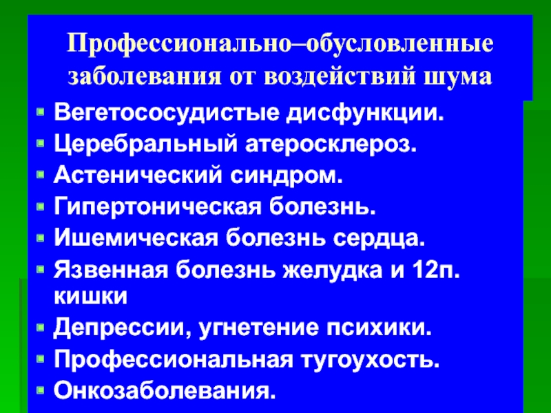 Слайд 3Профессионально–обусловленные заболевания от воздействий шума