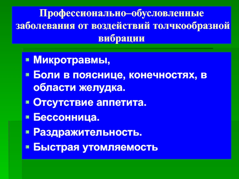 Слайд 24Профессионально–обусловленные заболевания от воздействий толчкообразной вибрации
