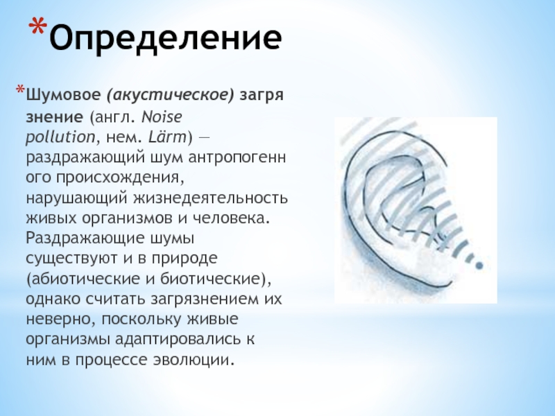 шумы существуют и в природе (абиотические и биотические), однако считать загрязнением их неверно, поскольку живые организмы адаптировались к ним в процессе эволюции.