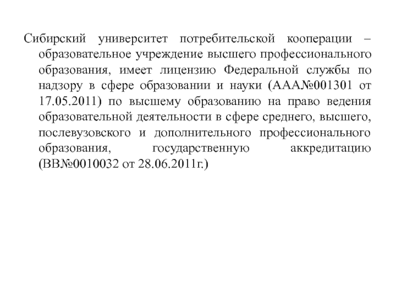 Слайд 2Cибирский университет потребительской кооперации – образовательное учреждение высшего профессионального образования, имеет