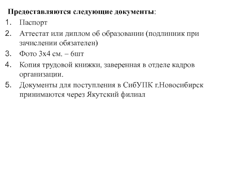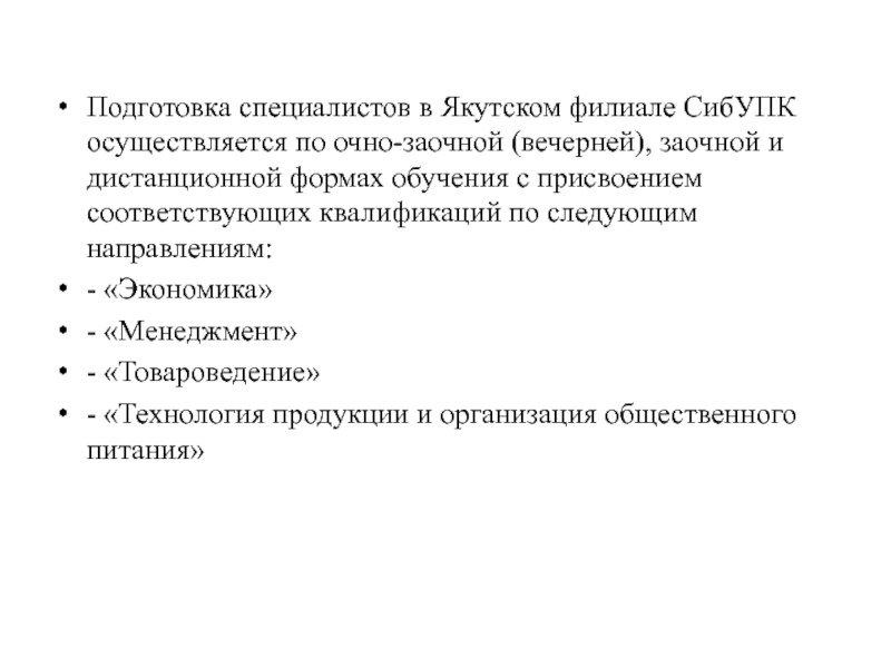 Слайд 3Подготовка специалистов в Якутском филиале СибУПК осуществляется по очно-заочной (вечерней), заочной