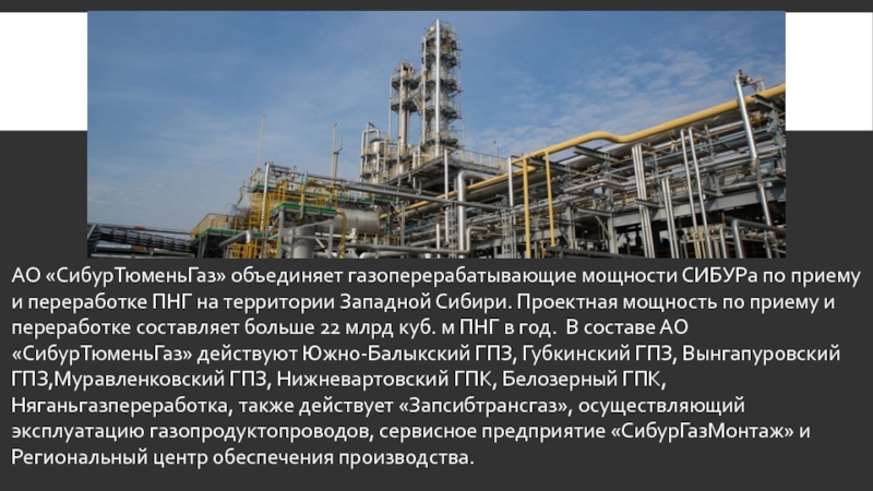 Основными продуктами производства предприятий группы «СибурТюменьГаз» являются сухой отбензиненный газ, широкая фракция легких углеводородов, пропан-бутан технический и бензин газовый стабильный. Эти продукты применяются в качестве сырья для нефтехимических и химических предприятий, которые производят синтетические каучуки, пластики, автомобильные шины, бензины, газомоторное топливо и топливо для промышленных и коммунально-бытовых нужд.
