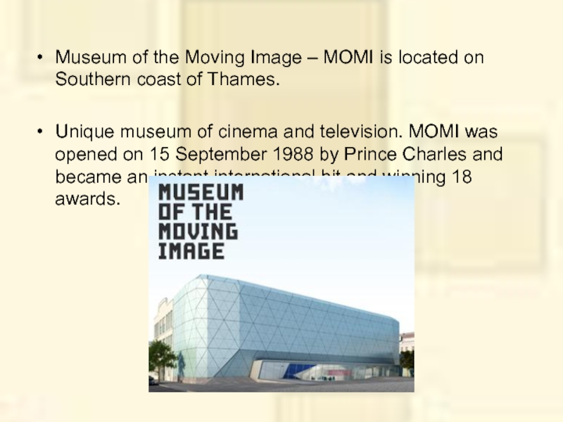 Слайд 12Museum of the Moving Image – MOMI is located on Southern