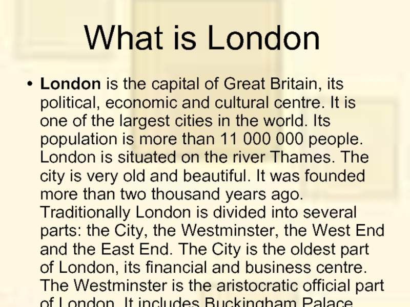 economic and cultural centre. It is one of the largest cities in the world. Its population is more than 11 000 000 people. London is situated on the river Thames. The city is very old and beautiful. It was founded more than two thousand years ago. Traditionally London is divided into several parts: the City, the Westminster, the West End and the East End. The City is the oldest part of London, its financial and business centre. The Westminster is the aristocratic official part of London. It includes Buckingham Palace, where the Queen lives, and the Houses of Parliament.