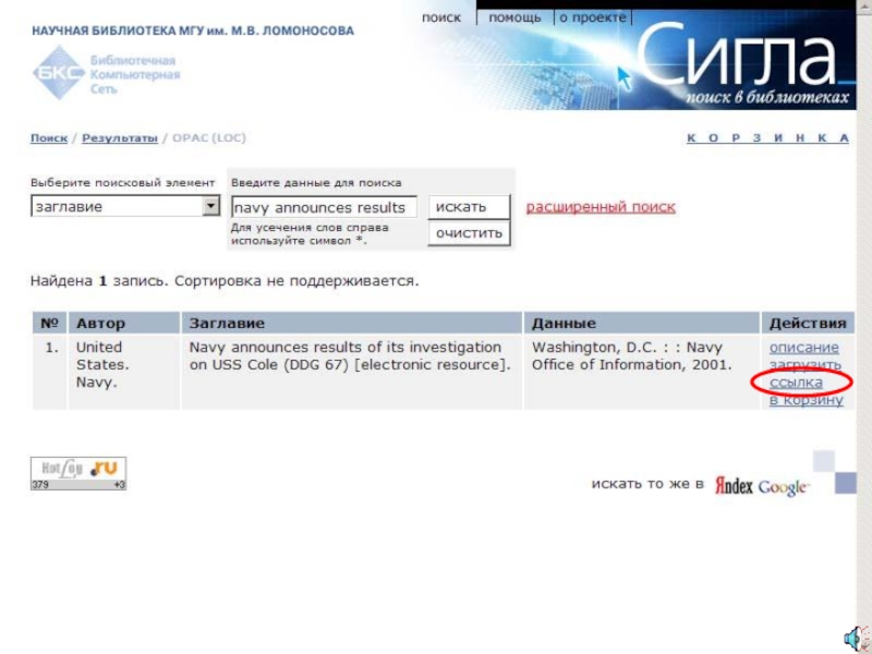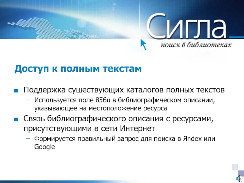Связь библиографического описания с ресурсами, присутствующими в сети Интернет