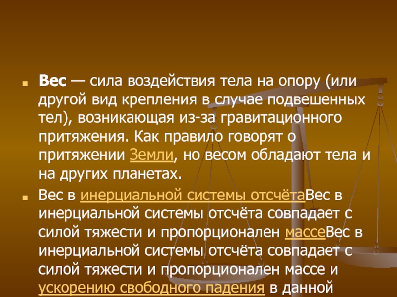 Вес в инерциальной системы отсчётаВес в инерциальной системы отсчёта совпадает с силой тяжести и пропорционален массеВес в инерциальной системы отсчёта совпадает с силой тяжести и пропорционален массе и ускорению свободного падения в данной точке