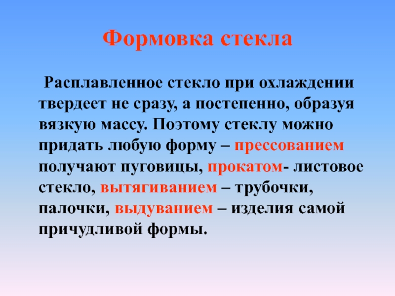 вязкую массу. Поэтому стеклу можно придать любую форму – прессованием получают пуговицы, прокатом- листовое стекло, вытягиванием – трубочки, палочки, выдуванием – изделия самой причудливой формы.