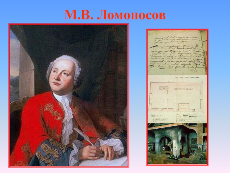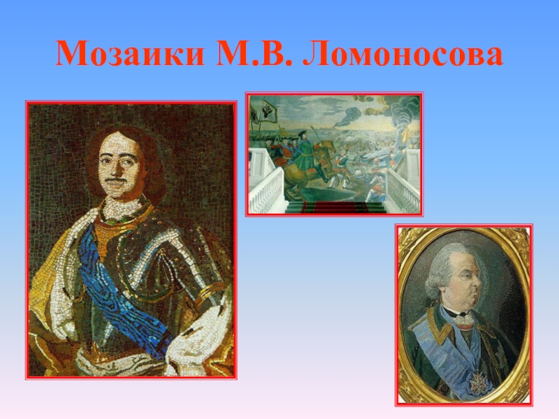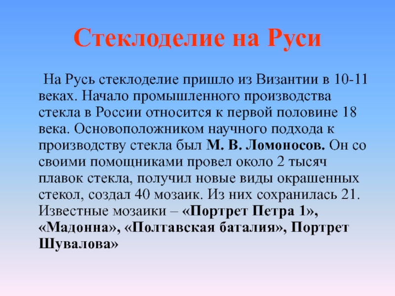 веках. Начало промышленного производства стекла в России относится к первой половине 18 века. Основоположником научного подхода к производству стекла был М. В. Ломоносов. Он со своими помощниками провел около 2 тысяч плавок стекла, получил новые виды окрашенных стекол, создал 40 мозаик. Из них сохранилась 21. Известные мозаики – «Портрет Петра 1», «Мадонна», «Полтавская баталия», Портрет Шувалова»