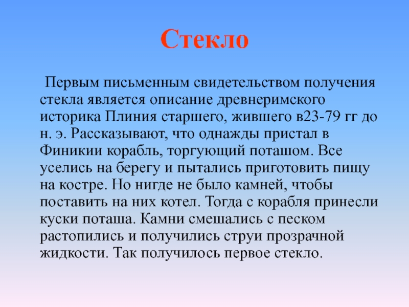 жившего в23-79 гг до н. э. Рассказывают, что однажды пристал в Финикии корабль, торгующий поташом. Все уселись на берегу и пытались приготовить пищу на костре. Но нигде не было камней, чтобы поставить на них котел. Тогда с корабля принесли куски поташа. Камни смешались с песком растопились и получились струи прозрачной жидкости. Так получилось первое стекло.