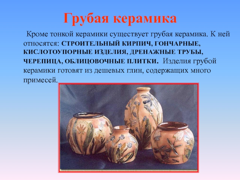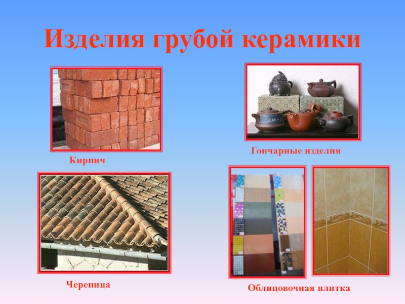 КИРПИЧ, ГОНЧАРНЫЕ, КИСЛОТОУПОРНЫЕ ИЗДЕЛИЯ, ДРЕНАЖНЫЕ ТРУБЫ, ЧЕРЕПИЦА, ОБЛИЦОВОЧНЫЕ ПЛИТКИ. Изделия грубой керамики готовят из дешевых глин, содержащих много примесей.