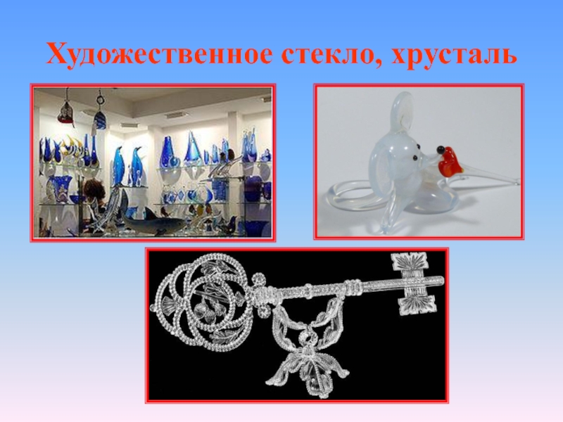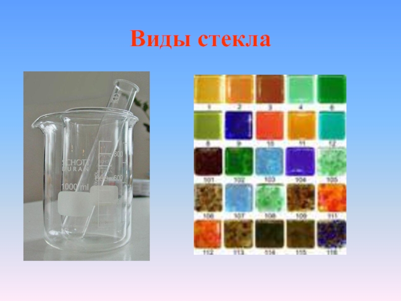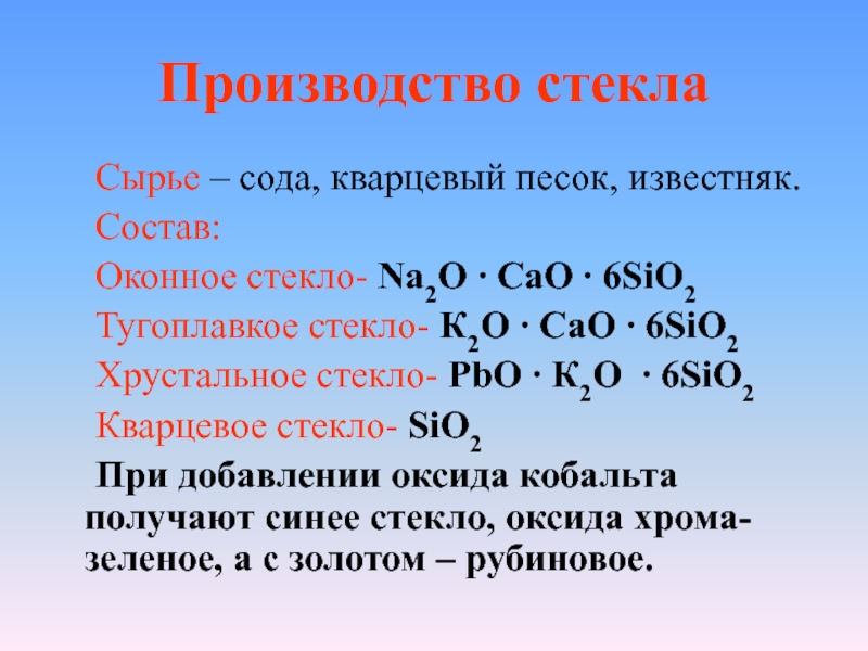 При добавлении оксида кобальта получают синее стекло, оксида хрома- зеленое, а с золотом – рубиновое.