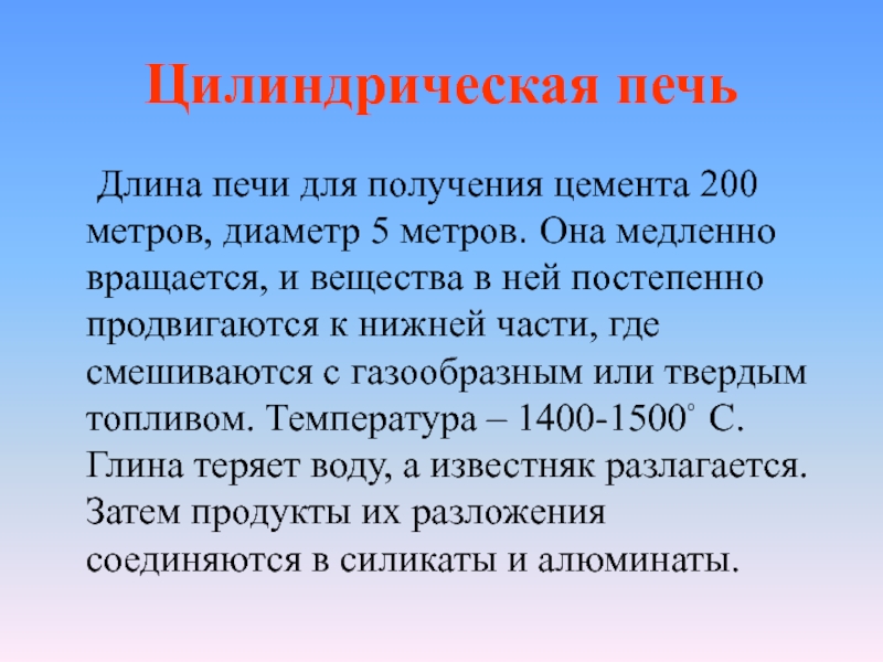 Она медленно вращается, и вещества в ней постепенно продвигаются к нижней части, где смешиваются с газообразным или твердым топливом. Температура – 1400-1500◦ С. Глина теряет воду, а известняк разлагается. Затем продукты их разложения соединяются в силикаты и алюминаты.