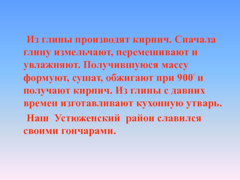 Из глины производят кирпич. Сначала глину измельчают, перемешивают и увлажняют. Получившуюся