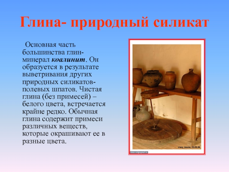 результате выветривания других природных силикатов- полевых шпатов. Чистая глина (без примесей) – белого цвета, встречается крайне редко. Обычная глина содержит примеси различных веществ, которые окрашивают ее в разные цвета.