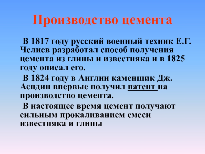 В 1824 году в Англии каменщик Дж. Аспдин впервые получил патент на производство цемента.