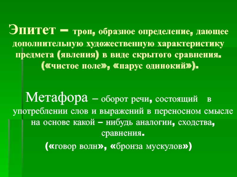 Метафора – оборот речи, состоящий в употреблении слов и выражений в переносном смысле на основе какой – нибудь аналогии, сходства, сравнения.