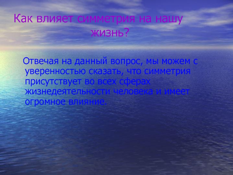 Отвечая на данный вопрос, мы можем с уверенностью сказать, что симметрия присутствует во всех сферах жизнедеятельности человека и имеет огромное влияние.