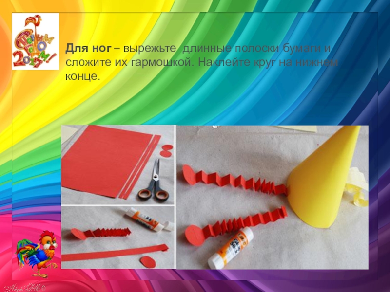 Слайд 5Для ног – вырежьте длинные полоски бумаги и сложите их гармошкой. Наклейте