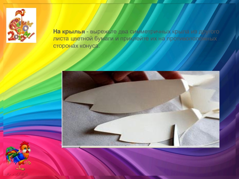 Слайд 6На крылья - вырежьте два симметричных крыла из другого листа цветной бумаги